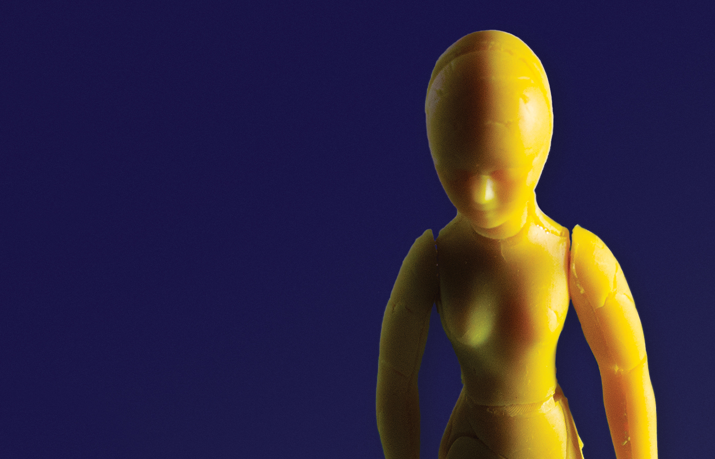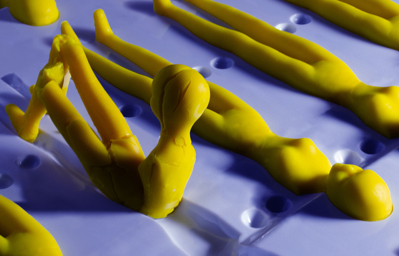 The aesthetic of the final artwork was achieved by forming Play-Doh figures with fondant icing moulds, taking multiple pictures, and then stitching them all together in Photoshop.